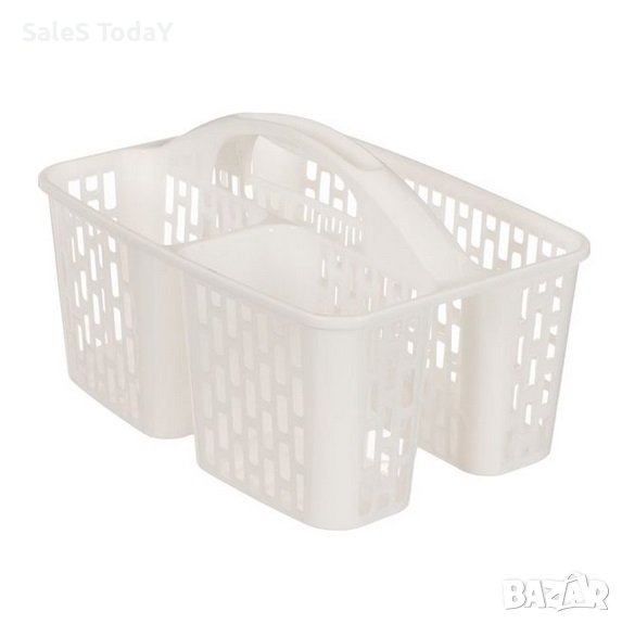 Кошница за съхранение на перилен препарат бяла пластмаса с перфориран дизайн и дръжка. Има едно пространство 29.5x9cm и 2 по-малки 14.5x9cm. Идеален е за бутилки от препарати, гъби и кърпи за прах. Той е ценен помощник в почистването, защото имате всичко събрано и подредено с вас наведнъж.