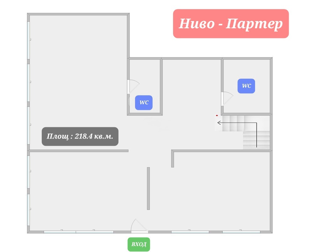 -Ниво партер е с площ от 218.4 кв. м и се състои е от едно голямо разчупено помещение с височина 3 метра и 2 санитарни възела.