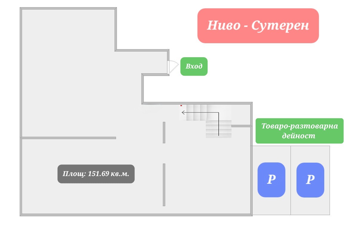-Ниво сутерен е с площ от 151.69 кв. м се състои от едно голямо помещение с височина 3 метра. Има възможност за товаро-разтоварна дейност на собствени паркоместа в подземния паркинг.