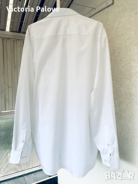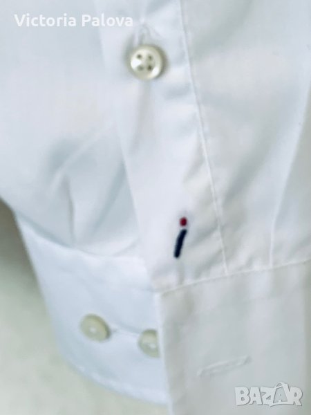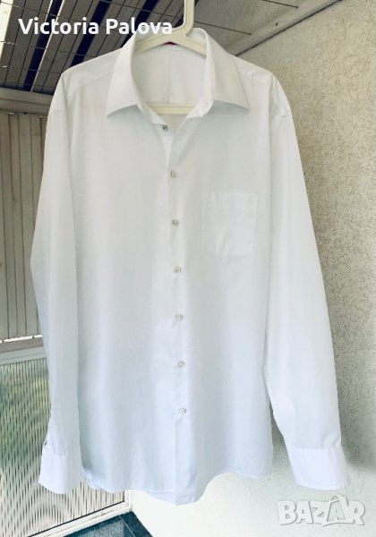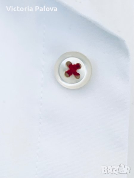 Неизползвана белоснежна риза с интересни детайли - на ръкава избродиран логотип и първото копче е зашито с червен конец. Прекрасен памук, лесно се поддържа. Рамо - 55см, ГО - 65см, дължина отпред - 85см, отзад - 89см, ръкав - 69-70см.