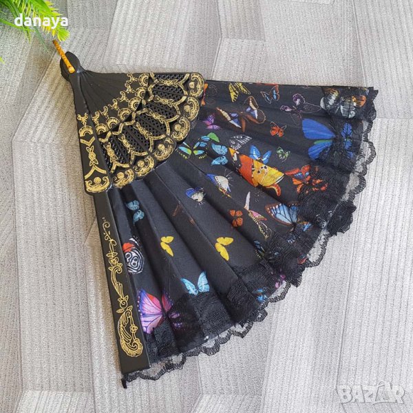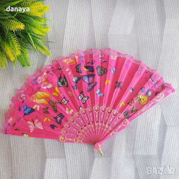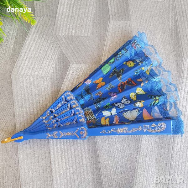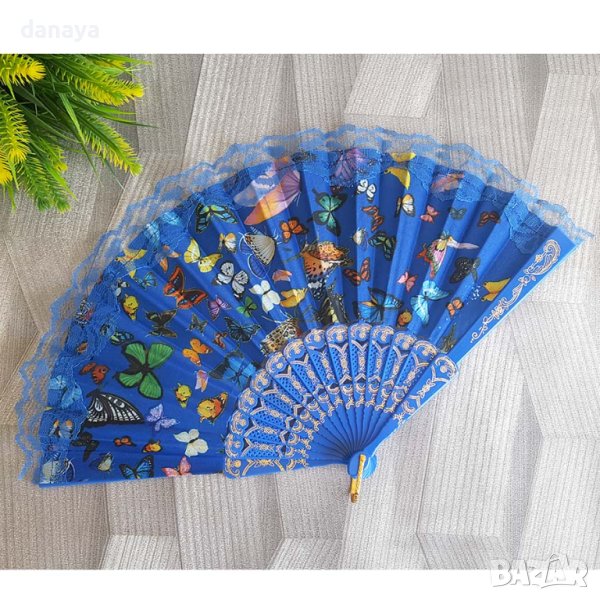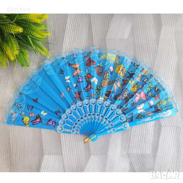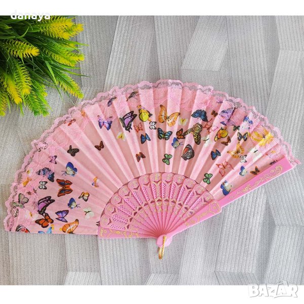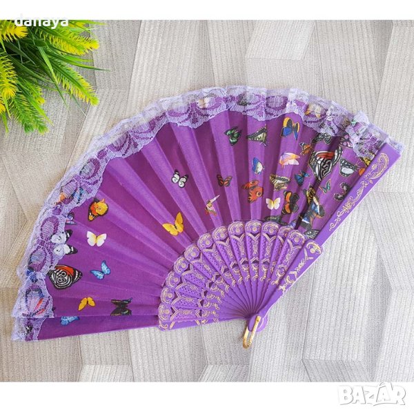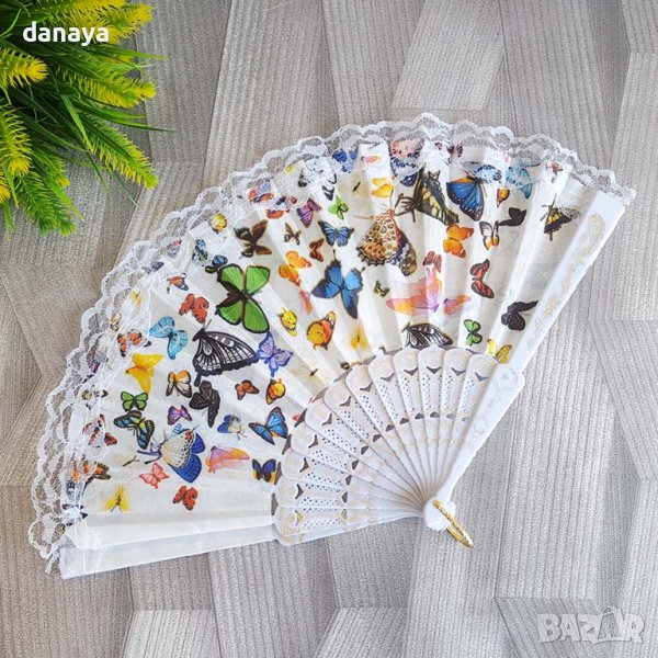 Красиво дамско ветрило с пеперуди и дантела. Изработено от пластмасова основа и текстил. Лесно отваряне и сгъване. С кука в края си за закачане на стена или за дамска чанта. Предлага се в различни цветове.