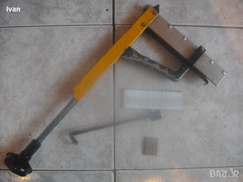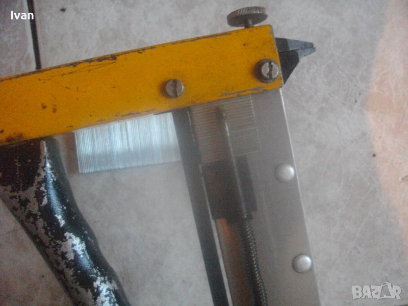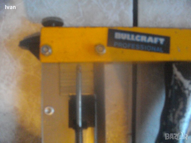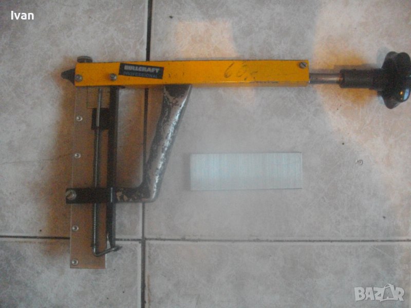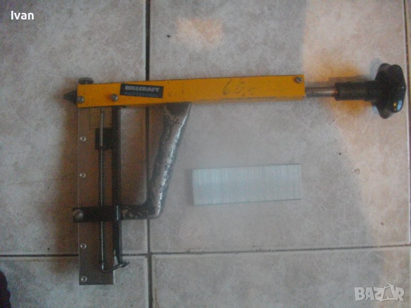 ОПИСАНИЕ на ръчен такер голям - цена 159 лв. Професионален. Марка и модел BULLCRAFT PROFESSIONAL.Немско произовдство, старо качество. Масивен алуминиев изцяло корпус и дръжка предна. Заден кръг дръжка топка на лоста бутало за забиване на скобите - от бакелит, голяма. Пълнител метален, голям, за около 150 бр. скоби. Дължина на такера в отворено състояние на лостовото бутало - 43 см, дължина надолу на инструмента - 22 см. За скоби кламери размери от 8 мм до 29 мм. Такера е зареден с дузина скоби размер 22 мм за проба и тест в офис Еконт. Към него давам още 1 блистер скоби размер 22 мм или по-големи.