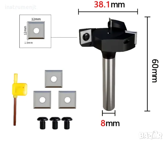Фрезер с опашка 8 мм (размери на снимките ) със сменяеми пластини- 82 € .Пластините могат да се въртят - имат 4 режещи ръба и така Вие имате 4 фрезера в един - купувате 1, а получавате 4 фрезера.Като резерва комплект 3 пластини,3 бр.винтове и шестограм - 20 €. При закупуване на фрезер и резервни 3 бр. пластини (последната снимка) цена 95 € .ЗВЪНЕТЕ НЕ СЕ ПРИТЕСНЯВАЙТЕ.МОЛЯ ВИЖТЕ И ДРУГИТЕ МИ ОБЯВИ.