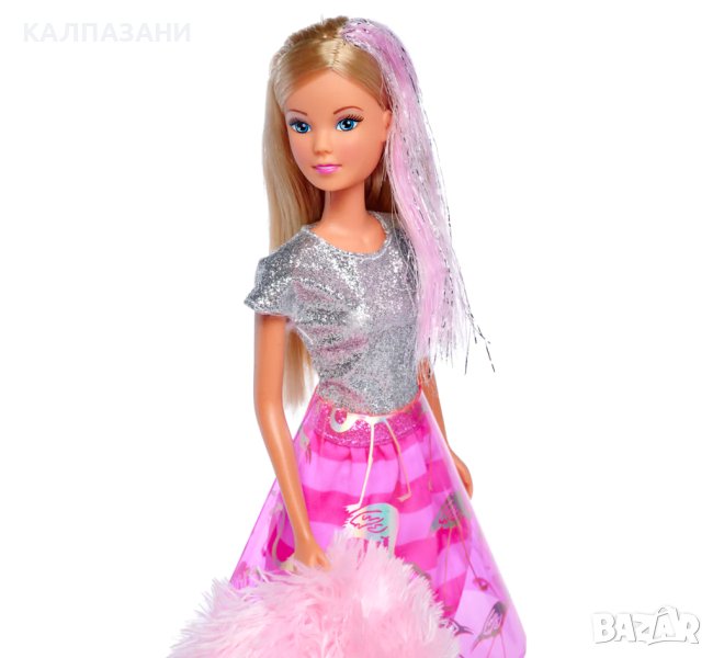 Комплектът включва допълнителна пола с розово и бяло райе и ефектна пухкава жилетка.