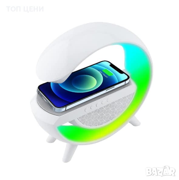 Многофункционална нощна лампа, безжично зарядно устройство за телефон, Bluetooth високоговорител, часовник и будилник в едно.