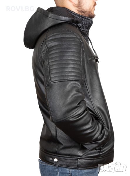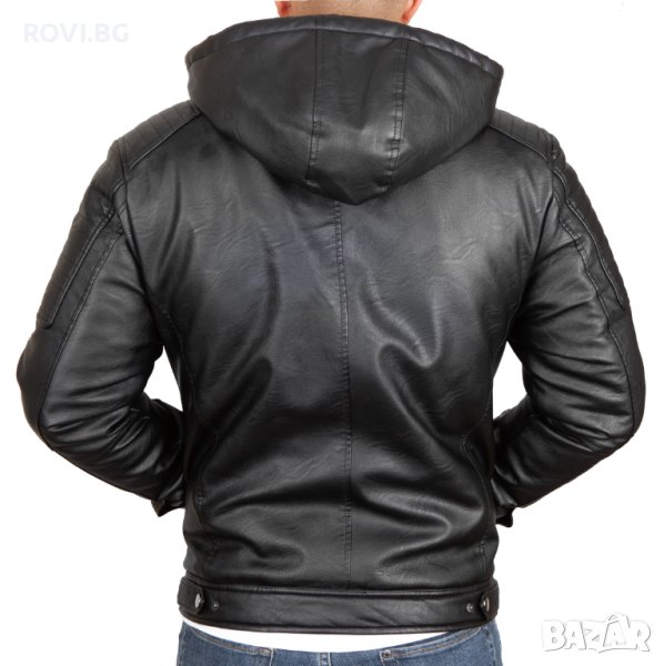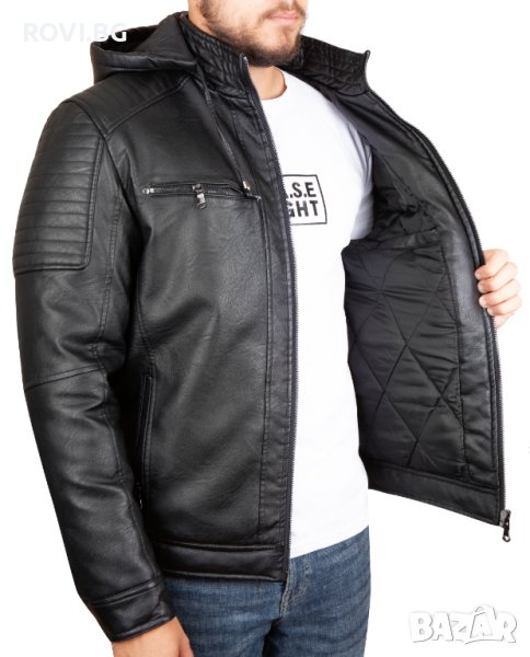 Мъжко кожено яке от висококачествена еко кожа. Вътрешната част е изработена от пресована вата и шушлякова подплата. Якето е подходящо за есенно-зимния сезон. Разполага с качулка, която може да се сваля и с два външни джоба с цип, два странични и един вътрешен джоб.