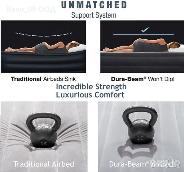 Надуваем матрак от INTEX, който с с новата технология Fiber-Tech го прави 100% по-издръжлив, 35% по стабилен и 15% по-лек.