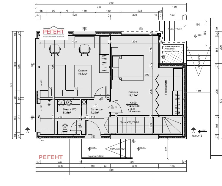 2-ри етаж- две спални, едната от който с гардеробна, тераса и баня с тоалетна.