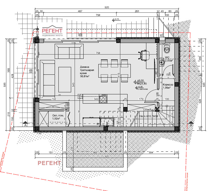 1-ви етаж- дневна с кухненски бокс, складово помещение и тоалетна.
