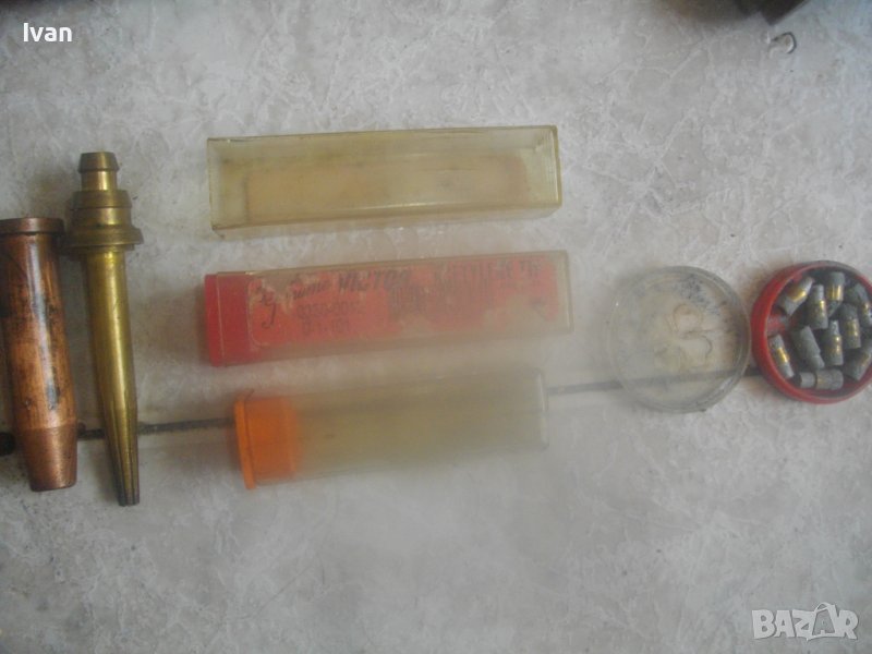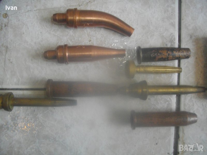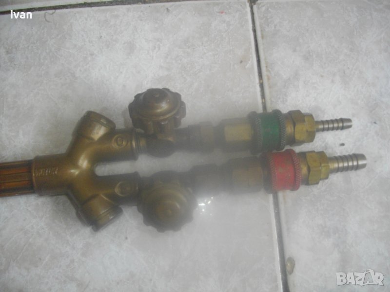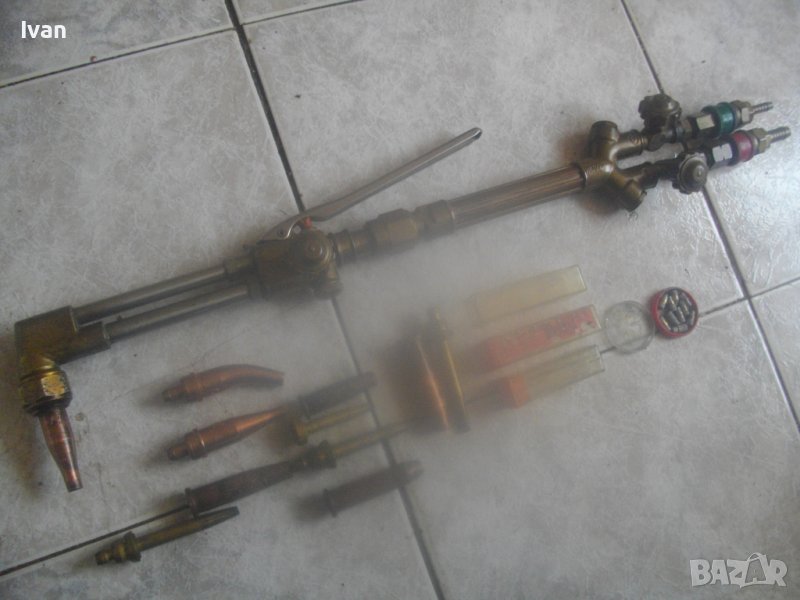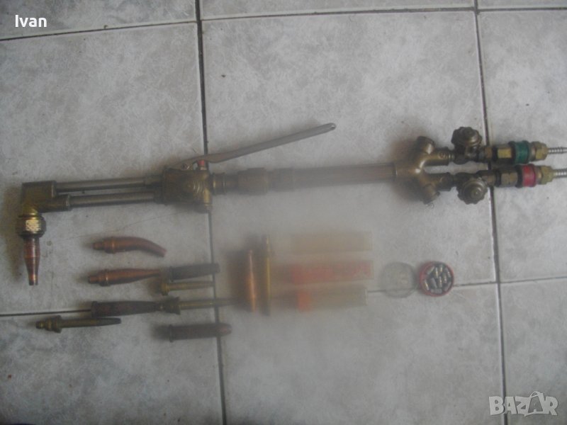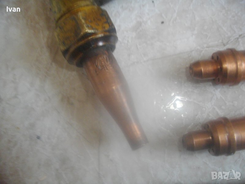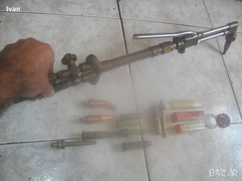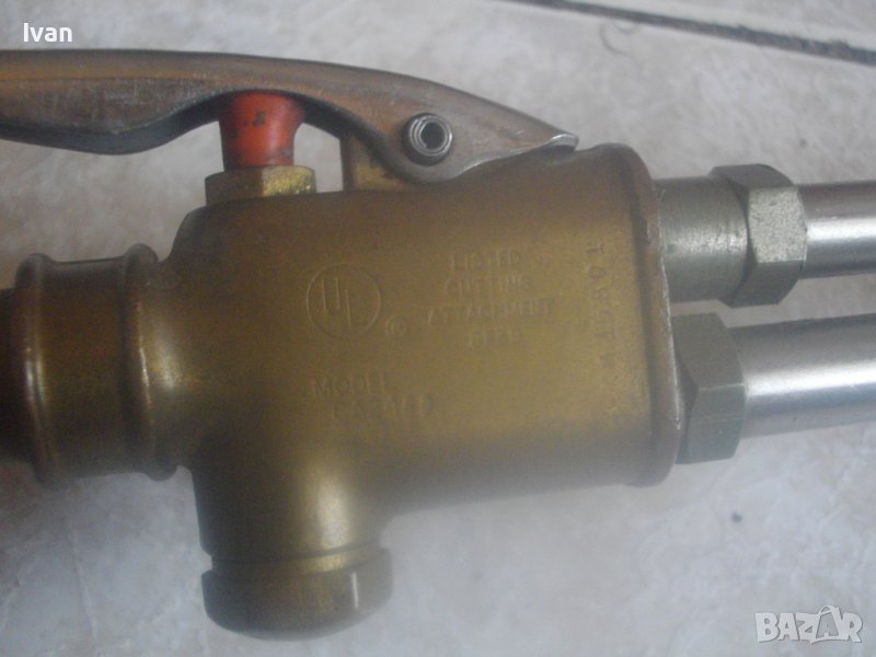 ОПИСАНИЕ на САЩ оригинален резак 59 см с дюзи - цена 499 лв. Марка и модел VICTOR 8F39 model CA 2460. VICTOR An Vec USA - Professional Listed Cutting. Ориганилна произовдство САЩ. Инструмента е поти нов, много малко ползван. В отлично визуално и техническо/работно състояние. Масивен. Дължина цялостна с поставени 2 оригинални на марката щуцери с функция въртеливост - 59 см. Наличие на сериини номера и типове модели на съставните части на резака. Бронзова изцяло дръжка, с бронзови щуцери, бронзова глава за две тръби, двутръбно рамо с оловно.цинкови 2 тръби, отпред бронзаво глава за контактна дюза. Поставена голяма медна контактна дюца с дължина 70 мм и 1 голяма дупка за пламъка. Дълъг масивен 18 сантиметров спусък, метален с хром покритие. 3 спирателни бронзови крана масивни, които са в пълна изправност. Към резака има оригинални още дъпълнителни конкатни дюзи големи - 6 бр и кутия с 10 бр. разпръсквачи за дюзи. Две от дюзите са съвсем нови и неизползвани - за ацеетилен. Дюзите са професионални марки VICTOR ORIGINAL ACETYLENE и HARRIS - всички са големи, с различни дупки за пламъка, включително и за точково рязане. Тегло на резака - 1,9 кг. Тегло с дюзите и кутията аксесоари - 2,3 кг. Цена на всичко - 499 лв. Цена на отделни дюзи по договаряне - от 50 лв/1 бр. нагоре.