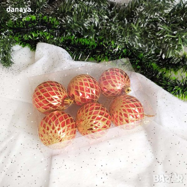 Комплект от 6 броя червени коледни топки за елха обсипани със златист брокат. Красиви играчки за коледната елха в червен цвят, красиво декорирани с брокатени частици. Топките се предлагат в прозрачна PVC кутия. Стоят много ефектно на елхата или като допълнение към гирлянди.