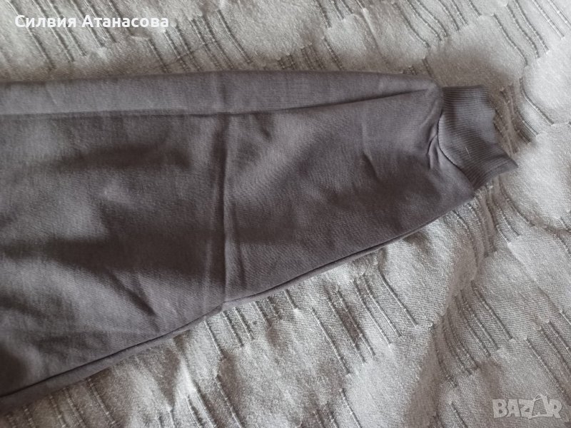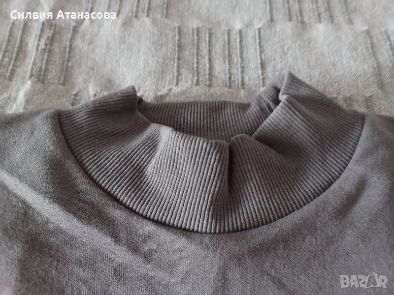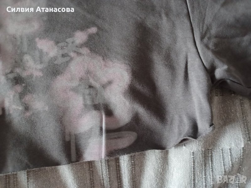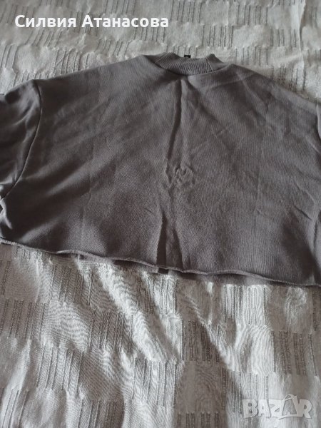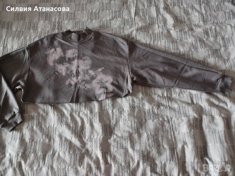 Блуза къса с широки ръкави, висока яка, сива с щампа, размер S, нова с етикет, без никакви забележки.