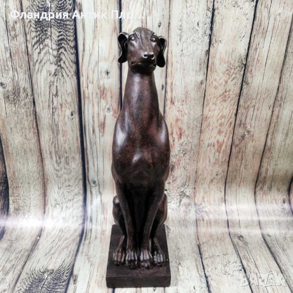 Те са изработени от смола с меко тъмно кафяво покритие и текстурни фини акценти, които подчртават в детайли чертите на хрътката. Поставени в наблюдателна, седнала позиция, тези скулптури на хрътки са стабилизирани за пода с правоъгълен постамент.