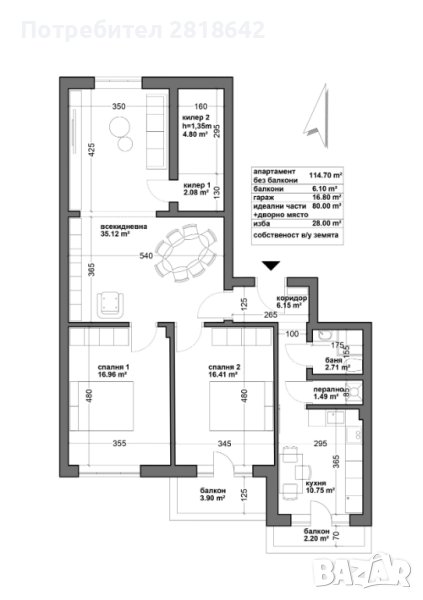 2 спални, дневна и трапезария, кухня, баня и тоалетна, перално помещение и килер.