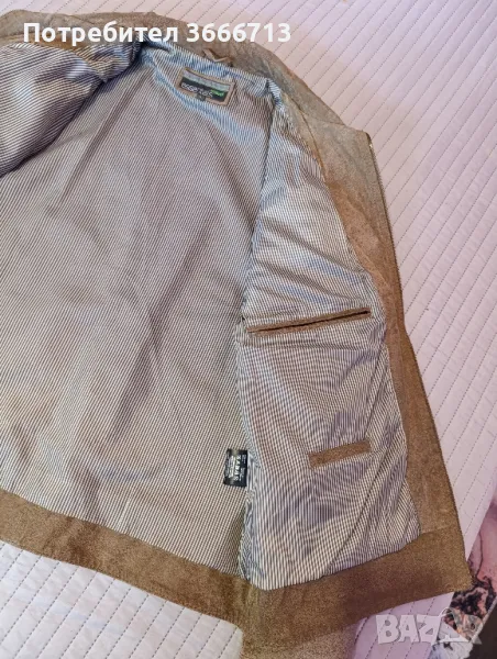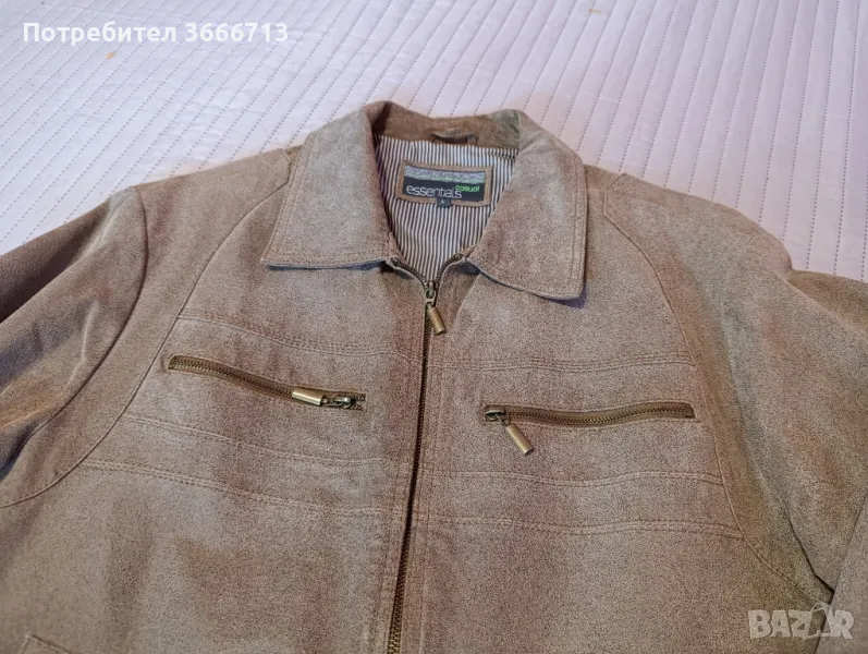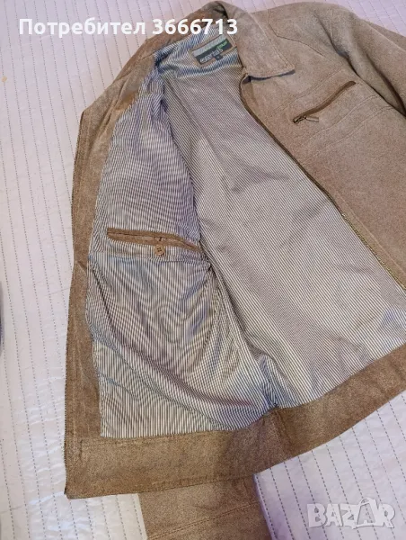 Якето е в много добро състояние. По етикет е размер Л с гръдна обиколка 120см. талия 116см. дължината е 68см. Има 4 външни джоба два от,които с цип и три вътрешни. Якето е на кожа и хастар без вата сезон есен пролет.Цветът е бежов-натурален.