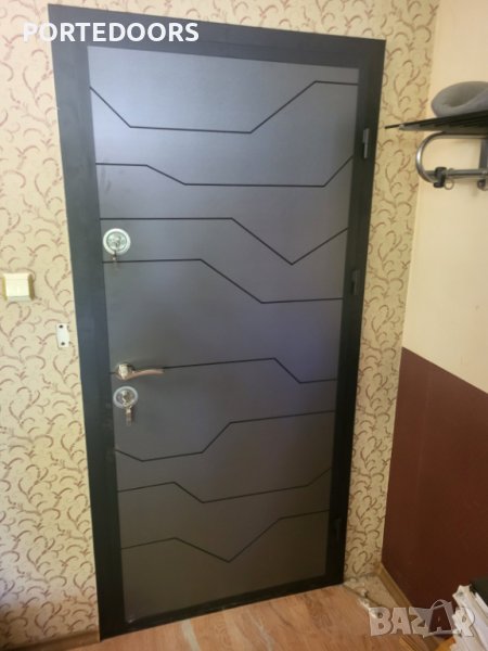 Входна блиндирана врата, изработена от 1.2 мм прахово боядисан метал и 10 мм MDF фрезован панел с ламинирано покритие.