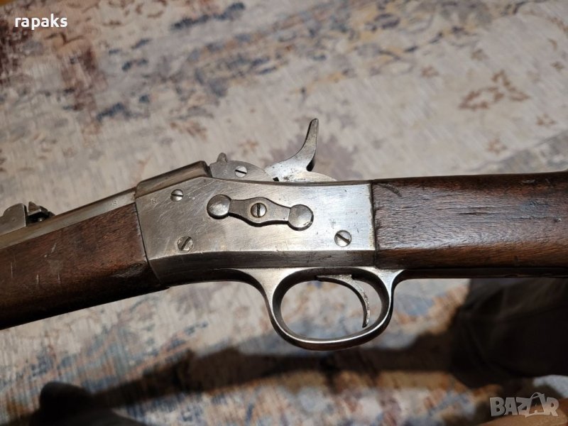 Патронен пехотен модел Remington, Ремингтон . Пушка в прекрасно състояние, комплектна с шомпул и технически изправна. Пълен оригинал, не реставрирана. Старинна чернобарутна пушка преди 1900 г. Не се изискват разрешителни за носене и притежание. Продавам много колекционерски оръжия, за това разгледайте обявите ми и се наслаждавате