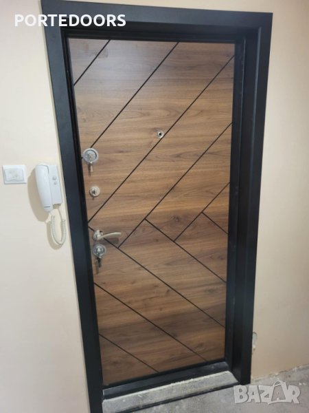 Входна блиндирана врата, изработена от 1.2 мм прахово боядисан метал и 10 мм MDF фрезован панел с ламинирано покритие.