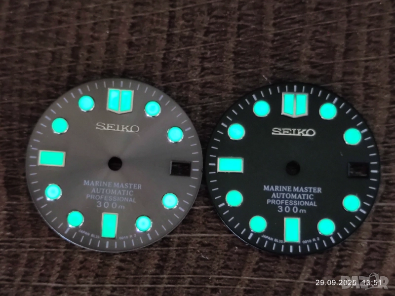 Продавам нови 28,5мм циферблати - Mod за Seiko. Ярка, зелена подсветка, бели индекси със сребърни кантове около тях. Черен и сребрист с металически отблясък. Циферблатите са със лого на Seiko. Посочената цена е за бройка.