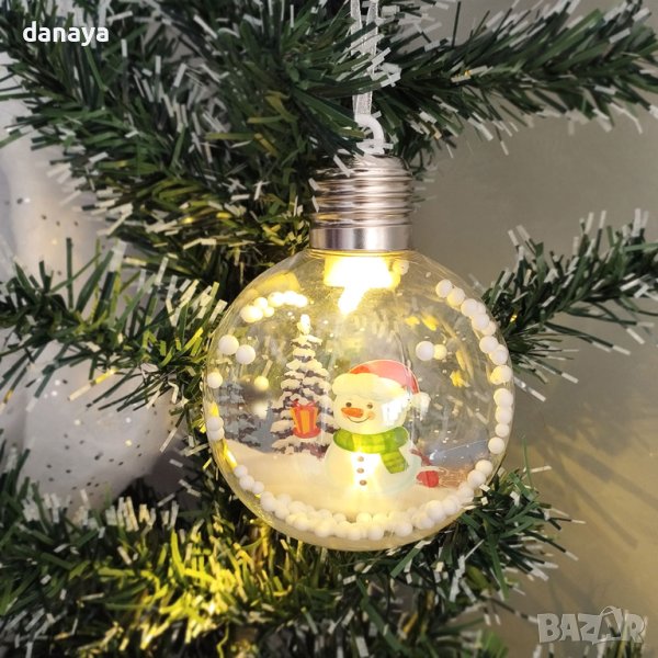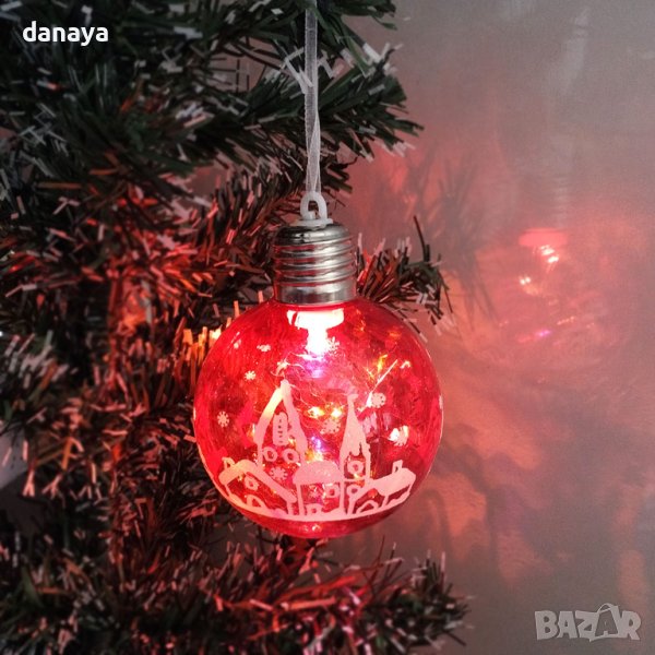 Светеща коледна топка за украса на елха, която се предлага в различни варианти на светене и шарки. С връвка за закачане на коледната елха. С бутон за включване и изключване на светлините. Когато е включена, топката изглежда много ефектно, където и да я поставите. Изработена от PVC. Работи с 3 LR 44 батерии, които са включени в комплекта.