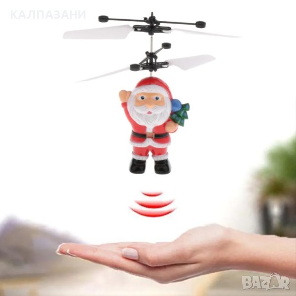 В комплекта ще намерите: фигурка на Дядо Коледа, закрепена на иновативна система за полет с гъвкаво витло, USB кабел за зареждане.