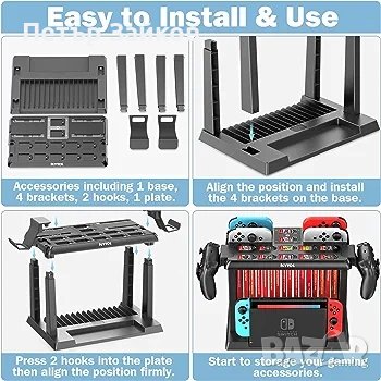 🎮【Как да инсталирате зарядното устройство Joy-con】 Първо се уверете, че всички части на хранилището за аксесоари Nintendo Switch са на мястото си. Второ, подравнете 4-те скоби с основата и след това инсталирайте държача за съхранение за Switch OLED. Трето, инсталирайте 1 плоча за зареждане и 2 куки за контролери на хранилището за игри на Switch. И накрая, започнете да зареждате Joycons и да съхранявате Switch аксесоари с Switch Storage Tower.