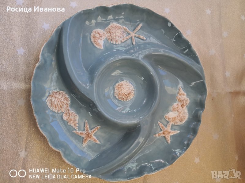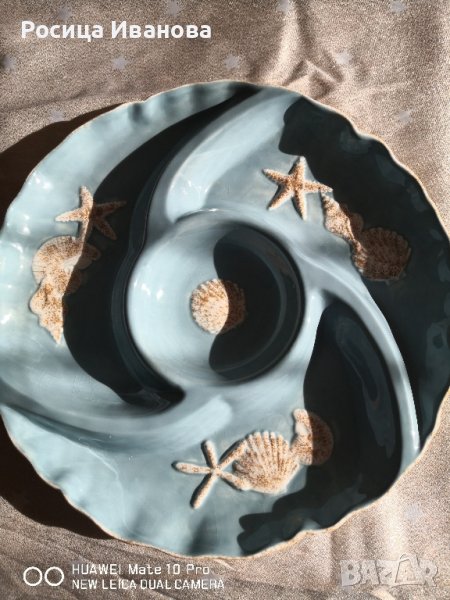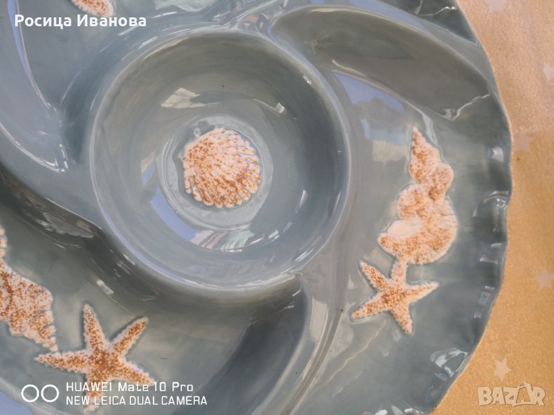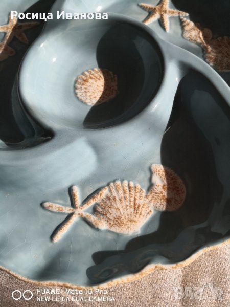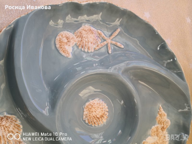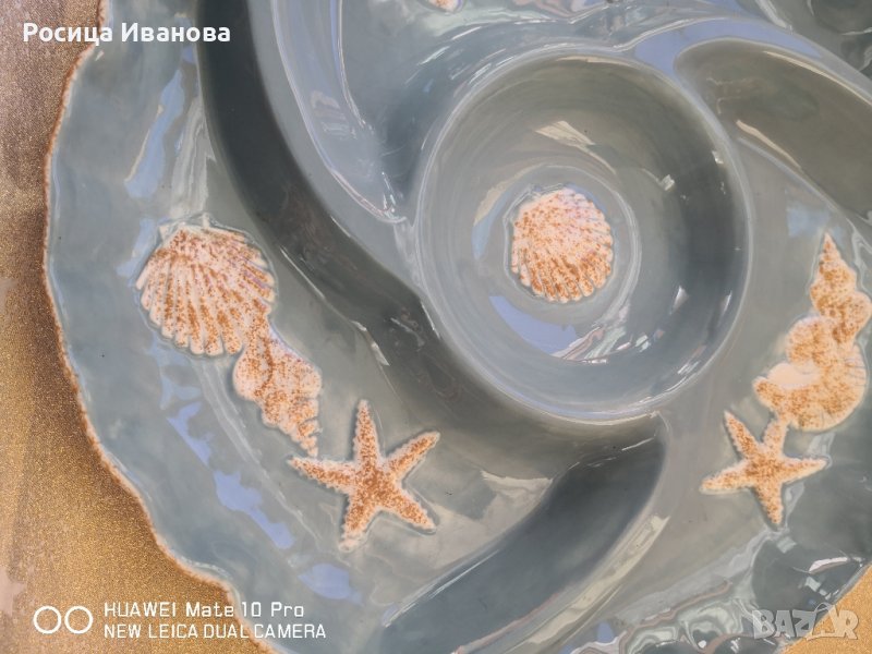 Голямо плато за сервиране с релефни морски елементи. Глазурата има лек напукан ефект