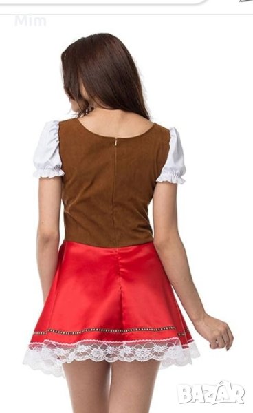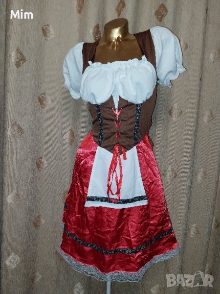 Мини рокля с открити рамене и щампа в баварски стил върху корсаж. Полата има прикрепена престилка отпред и дантелен подгъв ,закопчаването е отзад с цип. Подгръдна 52 до 60 см едностранно, талия 46 до 55 см едностранно, дължина 97 см. Перфектен костюм за Октоберфест или международни дни .Неразличима от нова без хартиен носител.