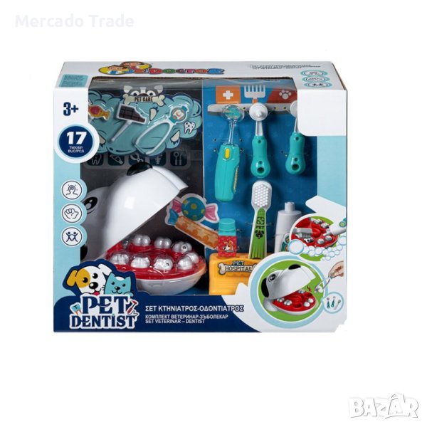 Кучето има нужда от грижи за зъбите си. Ветеринарният лекар - зъболекар отстранява повредените му зъби, проверява устната му хигиена и измива зъбите му със специалната паста за животни. Стоматологичното огледало има светлина, а ваденето на зъб има звук. Играта на преструвки помага на децата да развият своите интелектуални умения и да формират своя характер.
