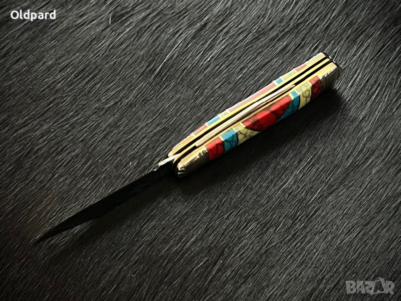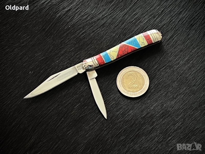 Висококачествен компактен колекционерски джобен сгъваем нож Stoneworx Peanut. Две неръждаемо остриета 440А с огледално покритие. Подложка от никел и сребро. Дължина в сгънато състояние 7.2 см. Дължина на острието - 5.5 см. Тюркоазена, червена и жълта каменна дръжка. Уникална комбинация от материали - няма две абсолютно еднакви нож! Това е много красив и удобен нож за носене и използване всеки ден и за събиране. Лимитирана серия.