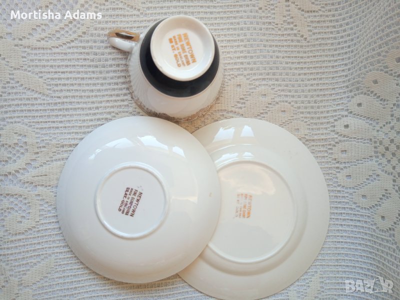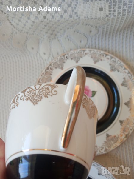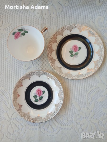 Красив английски троен сет, фин порцелан, без чук и пук. Нормални следи от употреба. Забележки по позлатата. Моля, разгледайте снимките! Чаша 160мл., чинийки с диаметър 13,5см. и 16см.