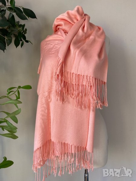 Розов шал от кашмир/ цвят сьомга, голям размер 185 Х 68 см, широк и дълъг шал от плътен кашмир, наситен розов цвят, нов. Доставка с Еконт. Цена на този 15 €.