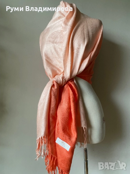 Шал от 70 % кашмир и 30 % коприна в цвят сьомга, преливащ от бяло до наситено бананово - розов цвят, графична, лъскава материя, нов, за любители на цветна визия. Доставка с Еконт.