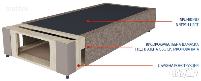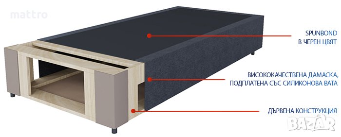 Вътрешната конструкция е дървена - стабилна и издръжлива на натоварване, а отгоре основата е завършена със стилна висококачествена дамаска в графитен цвят. Графитеният цвят прави хотелско легло Комфорт лесно за комбиниране с останалата част от помещението, като в същото време придава и допълнителен лукс. Под текстилната дамаска, производителите добавят силиконова вата, която омекотява ъглите. Хотелско легло Комфорт - Graphite е със скандинавско затваряне - част от дамаската покрива и горната част на основата. За да осугурят на потребителите здравословна среда за сън, Mattro конструират основата така, че тя да предлага оптимално проветрение - повдигната е на крачета (5 см), а отгоре и отдолу е добавен Spundond в черен цвят, който е с дишаща структура. Основата е подходяща за употреба с двулицев матрак, като му осигурява нужната подкрепа за спокоен и комфортен сън.