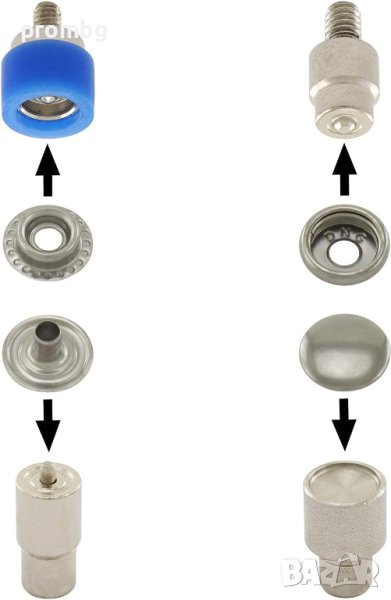 преса с 2 преходника, 4 елемента на матрици, 50 бр. тик так копчета (15 мм), 3 болта за монтаж към основата, лимбус.