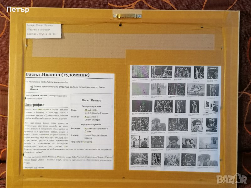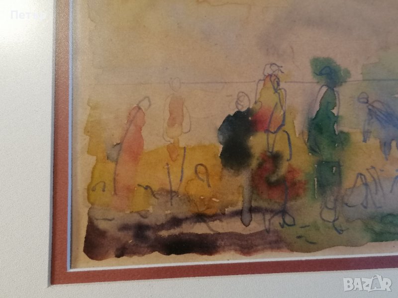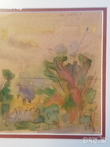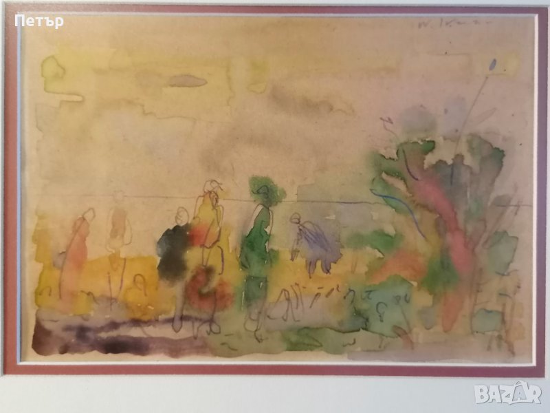 Продавам колоритен акварел на Васил Иванов (1909-1975) - название "Пейзаж с фигури". Художникът е известен с космическите си пейзажи. Има творби в Националната художествена галерия. Подписан горе вдясно. Поставен е в красива дървена рамка и паспарту. Размер на рамката 44х36 см, а на пейзажа 27х19.5 см.
