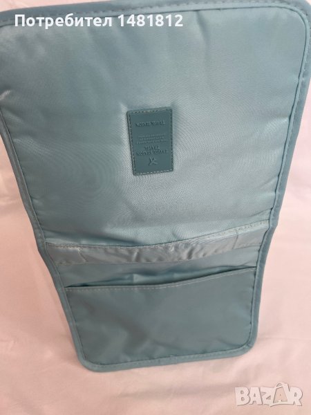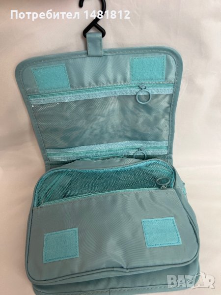 Унисекс пътнически несесер за принадлежности.Бебешко син цвят с вътрешни и външни джобчета и кукичка за закачване