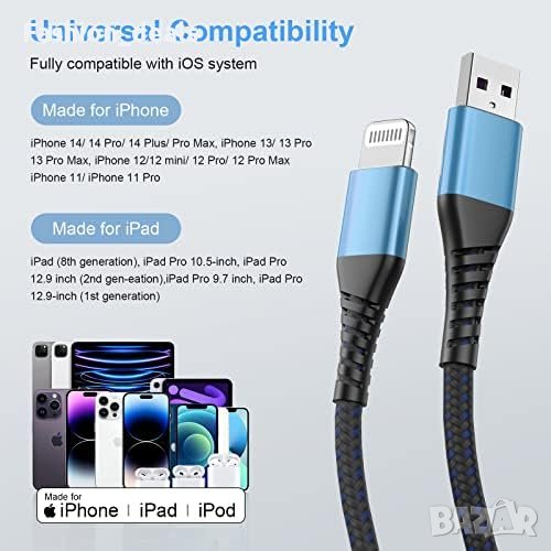 Нови 2 броя Плетени дълги кабели за бързо зареждане за Apple iPhone Айфон