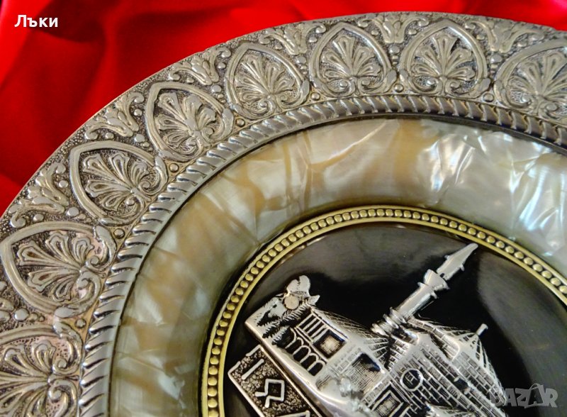 Гърция.Ръчно изработено с красива периферия от калай,декорирана с разкошни релефни орнаменти,седеф с ефектни нюанси,фина релефна апликация от златен месинг и релефно калаено изображение на една от забележителностите на град Йоанина – Джамия Фетие.Основата