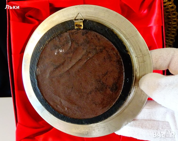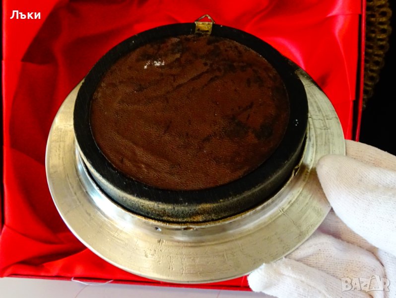е от естествено дърво.Има стабилна месингова окачалка за стена.Диаметър 14.5 см.,височина 3 см.,тегло 330 гр.