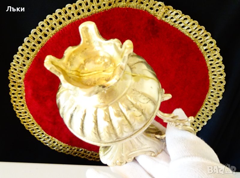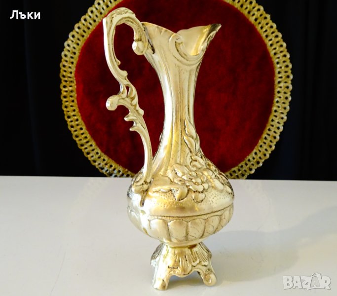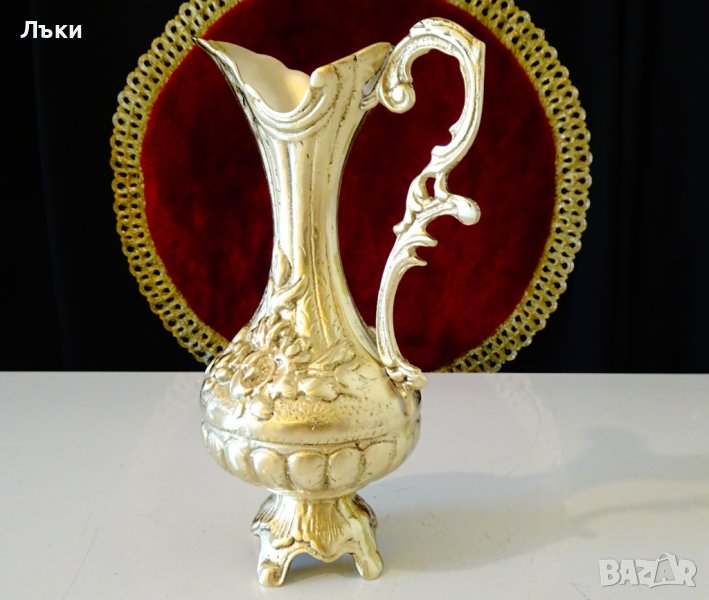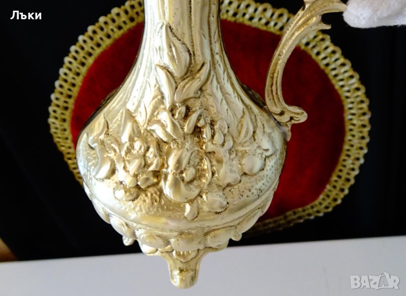 Старинна италианска кана за ракия,ваза,майсторска ръчна изработка от масивен високо качествен бронз със златен блясък.Декорирана с два релефени букета от красиви цветя и разкошни барокови орнаменти.Височина 16.5 см.,диаметър 7 см.,тегло 440 гр.