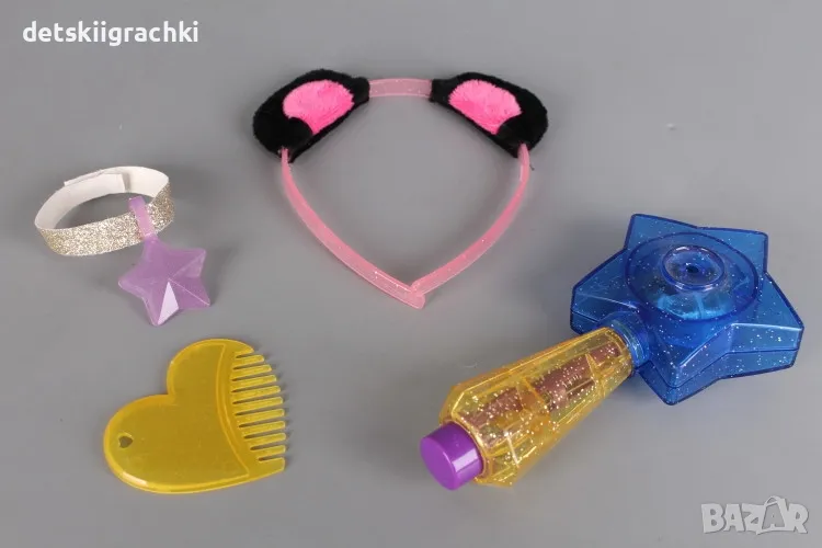 Комплекта съдържа мекичка плюшена играчка кученце и 6 аксесоара
