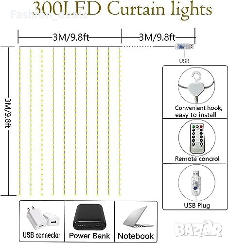 • 3м х 3м с 300 LED, 8 Режима, Дистанционно и Таймер