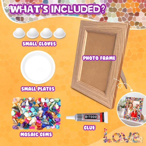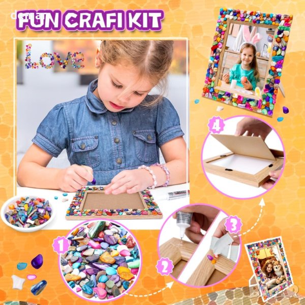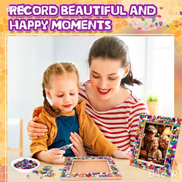 Комплектът Colorful Mosaic Photo Frame е увлекателен и креативен комплект за занаяти, идеален за деца и тийнейджъри. Включва дървена рамка за снимки (18,6 х 23,6 см), мозаечни цветни камъчета, лепило, тави, гумени палеци и инструкции. Проектиран да пасва на снимки с размери 10 x 15 см, този комплект не само позволява лесно вмъкване на снимки, но и превръща рамката в красива, значима част. Това е висококачествен, издръжлив занаят, идеален за декорация на дома или офиса. Този комплект е чудесен за подобряване на координацията око-ръка, креативността на децата и предоставя забавен начин да прекарват времето си далеч от електрониката. Подходящо за деца на възраст 6-12 години, то е прекрасен подарък за различни поводи като Коледа, Деня на благодарността и рождени дни, идвайки в красиво изработена кутия.