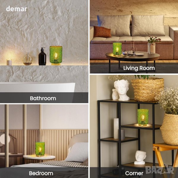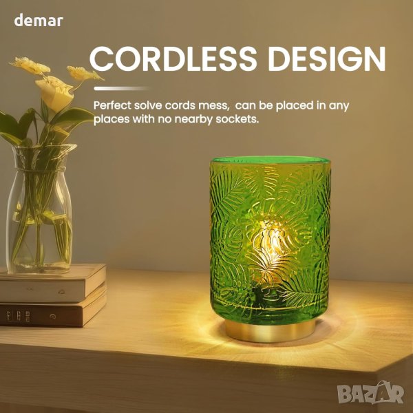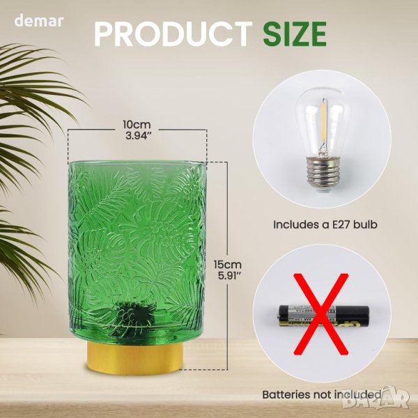 Елегантната безжична настолна лампа от Bonlux съчетава стъклен абажур с метална основа, предлагайки безжично удобство, идеално за зони без източници на захранване. Захранва се от 2xAAA батерии (не са включени), осигуряващи безопасност от токови удари, което го прави безопасно около деца и домашни любимци. Лампата включва 0,5 W топла бяла LED крушка, която е енергийно ефективна, с живот от 10 000 часа, осигуряваща топла и релаксираща светлина, подходяща за всяка стая. Тази зелена лампа служи както като функционален източник на светлина, така и като атрактивен декор за дома, идеален за всекидневни, спални, учебни помещения, маси за кафе, офиси и дори външни пространства. Също така е отличен подарък.Закупено от Amazon: www.amazon.co.uk/dp/B0CD3YXRTM?language=en-GB&ref_=cm_sw_r_apin_dp_DTYX1YA3Z8WDADPC9EET