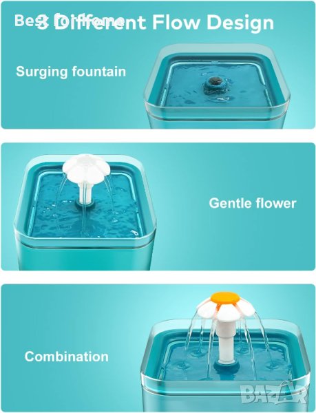 😽 【3 дизайна на воден поток】 Цветен водопад, цветен мехур, мек фонтан, всеки дизайн на воден поток може да отговори на различните нужди на домашни любимци. Този дизайн, подобен на играчка, различни форми на воден поток и ярки цветове могат да насърчат котката ви да пие вода, което е полезно за здравето на бъбреците на вашия домашен любимец.