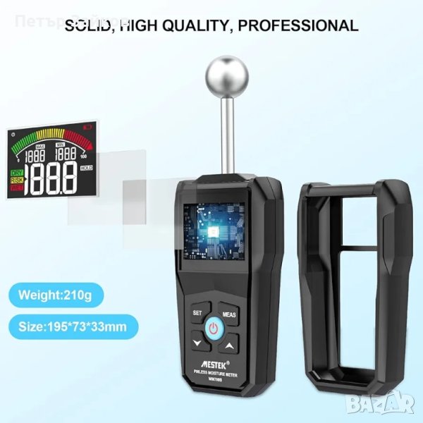 Професионално и точно измерване, без разрушаване】Влагомер с високопрецизна сонда от сплав и високопроизводителен чип за обработка, точно измерване, бърза реакция, обхват на измерване до 0,0-100,0. С функция за запазване на данни. Без поставяне на електроди или сонди в материала за измерване, високочестотните вълни на влагомера могат да проникнат на около 40 мм в зидарията и измерването на влагата няма да повреди повърхността на обекта.