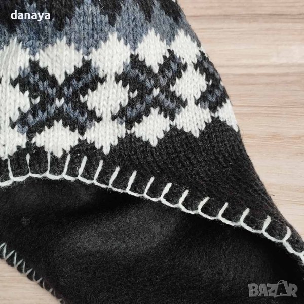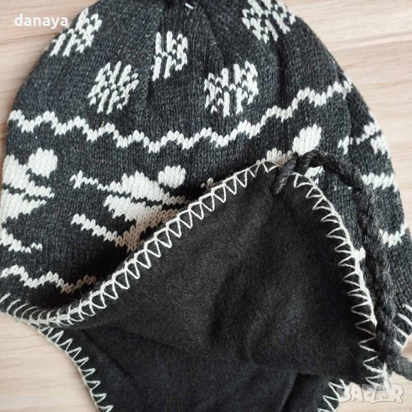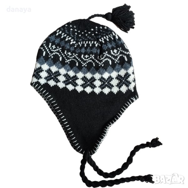 Плетена шапка тип ушанка с бели зимни шарки. Шапка за момичета и момчета. Може да се използва като детска зимна шапка, или като дамска шапка.