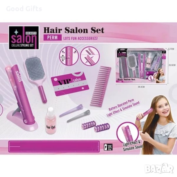 Комплектът ще се хареса на всяка малка госпожица. С него всяка стая ще се превърне във фризьорски салон и децата ще развиват въображението, креативността си и фината си моторика. Чудесен избор за всички момиченца, които се увличат по фризьорството или обичат да наблюдават как мама прави своята прическа. Всички аксесоари са с автентичен дизайн и безопасни за деца