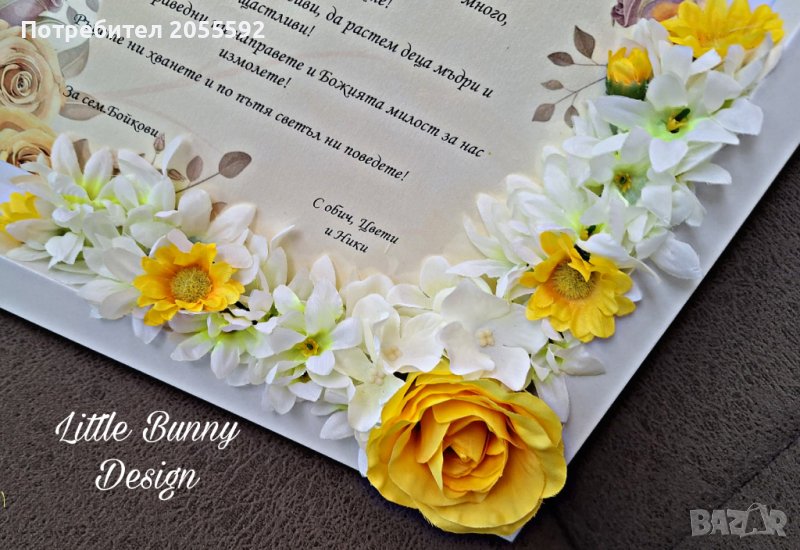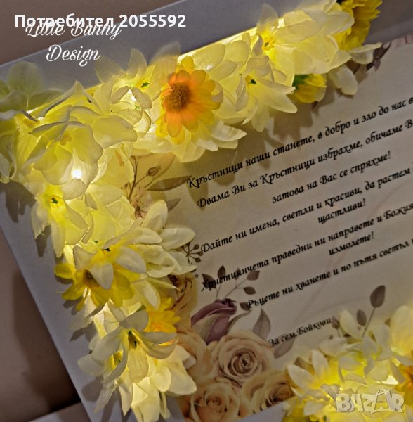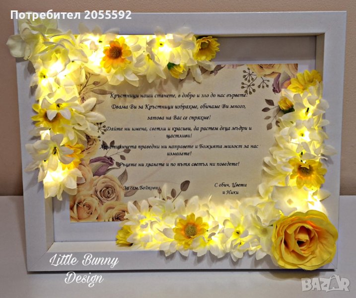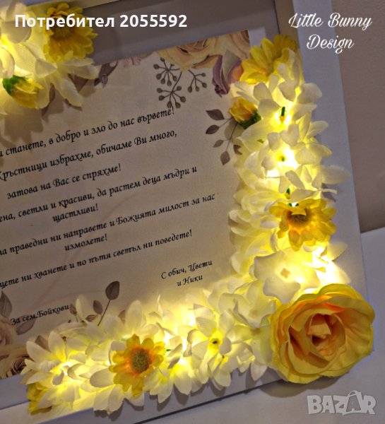 Поканата е с дървена рамка, декорирана с нежни цветя и вградено осветление. На гърба има стойка.